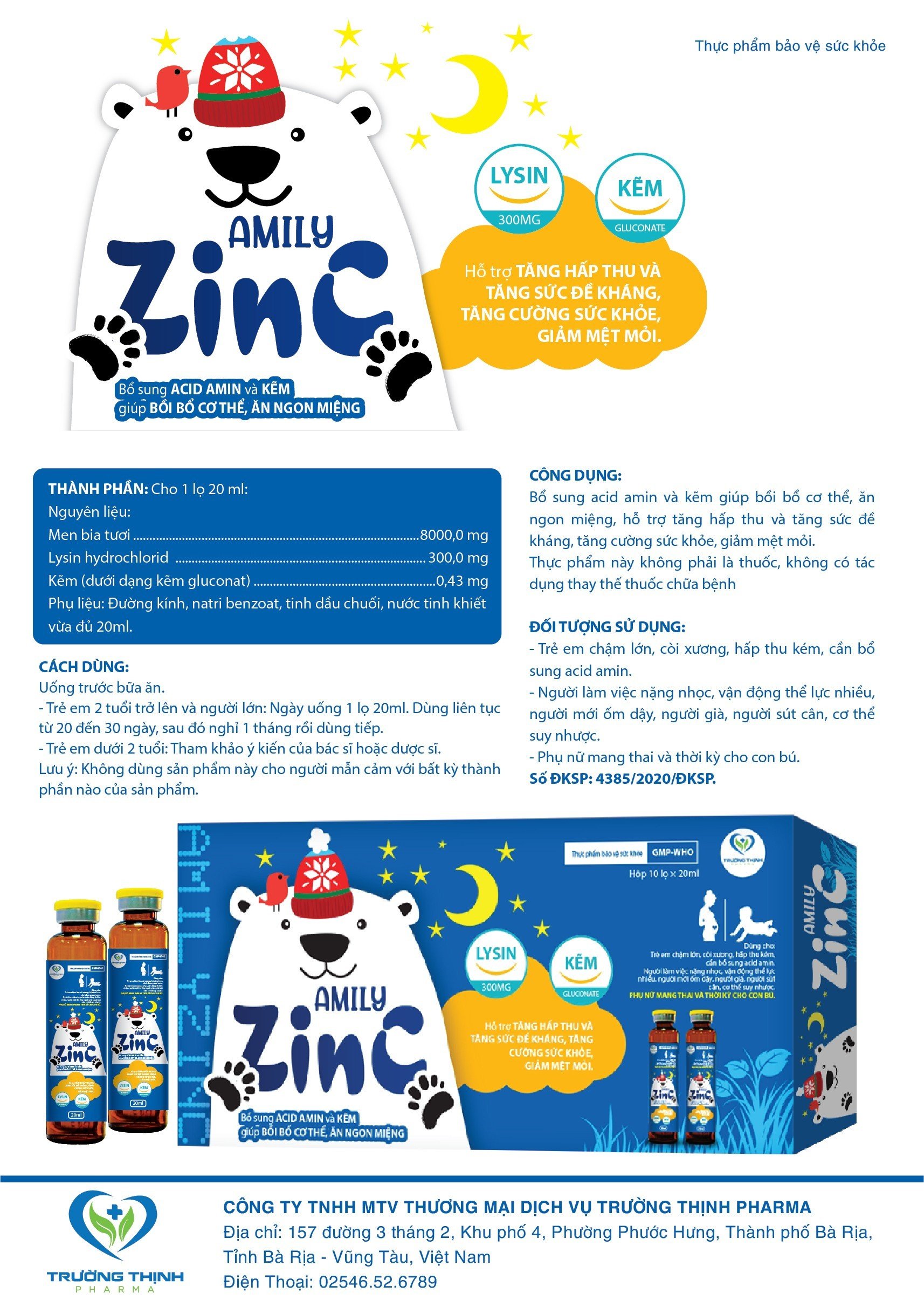 Bổ sung acid amin và kẽm giúp bồi bổ cơ thể, ăn ngon miệng, hỗ trợ tăng hấp thu và tăng sức đề kháng, tăng cường khoẻ mạnh, giảm mệt mỏi.